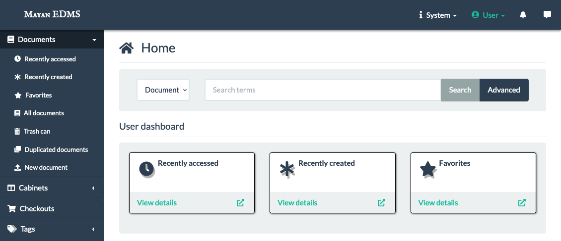To access Mayan EDMS, navigate to the domain name you associated with the NodeBalancer. Then log into Mayan using the administrator username and password provided (or created) earlier. This takes you to the homepage for your Mayan EDMS instance, where you can manage your instance’s setup and documents.